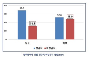 광주지역 임금노동자 10명 중 4명이 비정규직인 것으로 나타났다. 특히 여성과 고령층에서 비정규직 비율이 압도적으로 높아 ‘이중 차별’ 구조가 고착화되고 있다. 산업별로는 숙박·음식점업, 사회복지, 건설업 등에서 비정규직이 집중되는 양상이 뚜렷했다.5일 광주노동권익센터가 발간한 ‘2025 광주광역시 노동통계’에 따르면, 2024년 10월 기준 광주지역 임금노동자 59만 5704명 중 23만 3590명(39.2%)이 비정규직으로 집계됐다. 전년(38.4%) 대비 0.8%포인트 증가한 수치다.60대 이상 73.4% 비정규직… 연령 차별