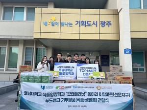 지난 11월 18일 호남대학교 식품영양학과 '브랜드플래닛' 동아리와 온마트 선운지구점에서 광역푸드뱅크에 따뜻한 나눔을 실천했다.이번 나눔은 동아리 학생들의 바자회 수익금과 온마트 선운지구점의 따뜻한 손길로 이뤄졌다.광역푸드뱅크는 전달받은 소중한 물품은 광주지역 내 여러 사회복지 현장으로 배분되어, 취약계층 이웃들의 건강한 식생활을 지원하는데 사용될 예정이라고 밝혔다.한편 광역푸드뱅크는 단체 및 개인으로부터 식품 및 생활용품을 후원받아 소외계층에게 전달하는 민간차원의 물적 전달 체계이며 올 한해동안 7400여명에게 51억 원 어치 물