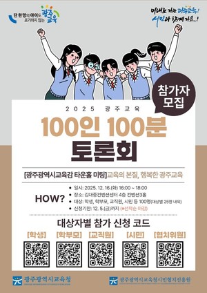 광주시교육청 시민협치진흥원이 오는 12월 16일 ‘2025 광주교육 100인 100분 토론회’를 열고 학생·학부모·교직원·시민이 함께 교육정책을 논의하는 시민 참여형 토론의 장을 마련한다.이번 토론회는 ‘교육의 본질, 행복한 광주교육’을 주제로, 시민이 교육정책을 제안하고 의견을 나누는 장으로 운영된다.토론회는 오후 4시부터 학생·학부모·교직원·시민 등 교육 주체 100명이 한자리에 모여 100분간 진행된다.1부 ‘원탁토론’에서는 참여자들이 12개 모둠조를 구성해 40분간 교육 정책 현안에 대해 자유롭게 의견을 나눈다. 모둠조는 학