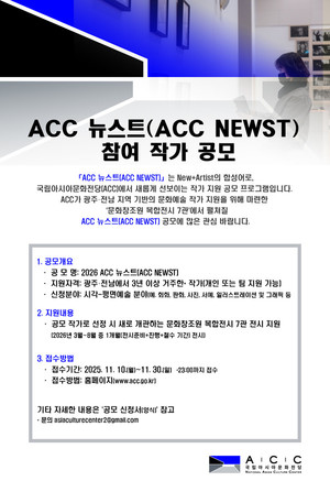 문화체육관광부 국립아시아문화전당(ACC)이 지역 작가 창작활동 지원 프로그램인 ‘2026 ACC 뉴스트(NEWST)’에 참여할 전시 작가를 오는 30일까지 공개 모집한다.‘뉴스트(NEWST)’는 새로움을 뜻하는 ‘New’와 예술가 ‘Artist’의 합성어로, ACC가 올해 개관 10주년을 맞아 새롭게 기획한 지역 작가 지원 프로그램이다.ACC는 광주전남지역에서 주로 활동하는 예술가들의 창작활동 및 전시 지원을 위해 오는 2026년 1월 지역 예술인을 위한 전시관인 복합전시7관을 문화창조원 내 새로 개관한다.복합전시7관은 약 132m