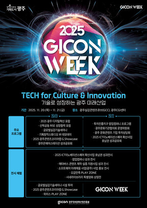 (재)광주정보문화산업진흥원(이하 GICON)은 광주 문화기술 산업의 성과를 공유하고 미래 비전을 제시하는 ‘2025 GICON WEEK’를 오는 20일부터 21일까지 이틀간 광주실감콘텐츠큐브(GCC) 및 GCC센터 일대에서 개최한다고 밝혔다.18일 GICON에 따르면 올해로 2회째를 맞은 ‘GICON WEEK’ 는 ‘TECH for Culture & Innovation’, ‘기술로 성장하는 광주의 미래 산업’을 주제로 한 해 동안 광주의 문화기술 산업이 이룬 성과를 공유하고, 지역 기업, 학교, 시민들이 함께 참여하는 포럼·세미나,