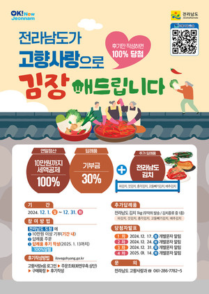 ‘고향사랑기부제 답례품 후기를 남기면 김장김치 드립니다.’전남도가 지난 1년간 기부자 사랑에 보답하기 위해 김장이 어려운 직장인을 대상으로 김치 제공 이벤트를 진행한다.3일 도에 따르면 ‘고향사랑e음’이나 전국 농협은행을 통해 전남도청에 10만 원 이상 기부하고 답례품을 주문·수령한 뒤, 후기를 작성하면 김장 김치가 자동 신청된다.파김치, 갓김치, 총각김치, 고들빼기김치, 배추김치 등 전남 김치 1kg이 추가 답례품으로 제공된다.이번 이벤트는 김장 시즌을 맞아 전남에서 생산한 농산물 소비를 촉진하기 위한 것으로, 노인 일자리사업에