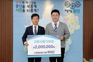 광주 광산구(구청장 박병규)는 13일 최병준 ㈜에이치엔스마트코리아 총괄본부장과 곽귀근 ㈜문화인광주 대표가 광산구 지역 발전을 위해 각 200만 원씩 총 400만 원의 고향사랑기부금을 기탁했다고 밝혔다. 최병준 총괄본부장은 광산경찰서 전의경회 총무로 활동하며 광산구 지역사회 봉사활동에도 적극적으로 참여하고 있다.KBS광주방송 열린마당 진행자로 알려진 곽귀근 대표는 광산구에 대한 남다른 애정으로, 지난 2023년 100만 원, 2024년 200만 원에 이어 3년째 고액 기부를 실천했다.전달된 기부금은 광산구 지역 발전과 주민들의 복지