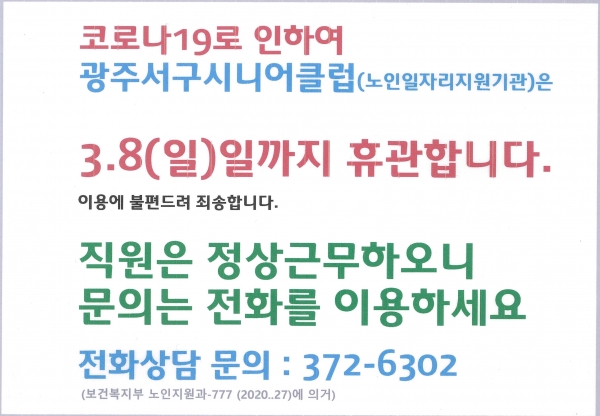 광주서구시니어클럽(관장 추왕석)이 코로나19 지역 확산을 막고, 어르신들 감염을 예방하기 위한 정부지침에 따라 3월8일까지 전격 휴관하기로 했다.