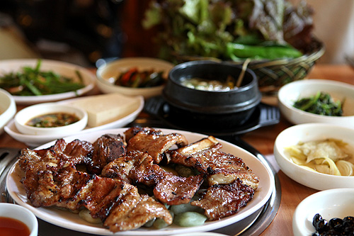 돼지갈비도 고슬고슬하니 구워내왔다. 고소하고 담백하다. 한번 애벌 굽고 한번 더 양념장을 발라 두벌구워 나온 갈비다. 기름진 고기류와 담백하고 깔끔한 밑반찬이 궁합을 맞췄다.