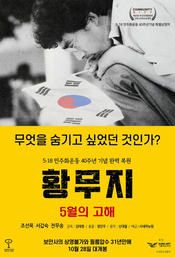 ‘칸트씨의 발표회’(1987)는 1987년 6월 항쟁이 끝나고 잠시 유화국면이 펼쳐지던 시기에 만들어진 35분 분량의 ‘5월 영화’다. 그리고 16mm 장편영화인 ‘황무지’(1988) 역시 그 연장선에서 만들어진 영화다. 그러나 <황무지>는 군 수사 정보기관인 보안사로부터 상영불가 판정을 받고 필름을 압수당하는 등 보안사의 방해로 관객들을 만나지 못했다. 그리고 올해 5·18 40주년을 맞아 남아 있던 베타 테잎을 되살려 두 편의 영화를 이어 붙였고, 김태영 감독과 조선묵 배우가 망월동 구 묘역을 방문한 장면까지를 더해 ‘황무지 5월의 고해’로 다시 태어났다.