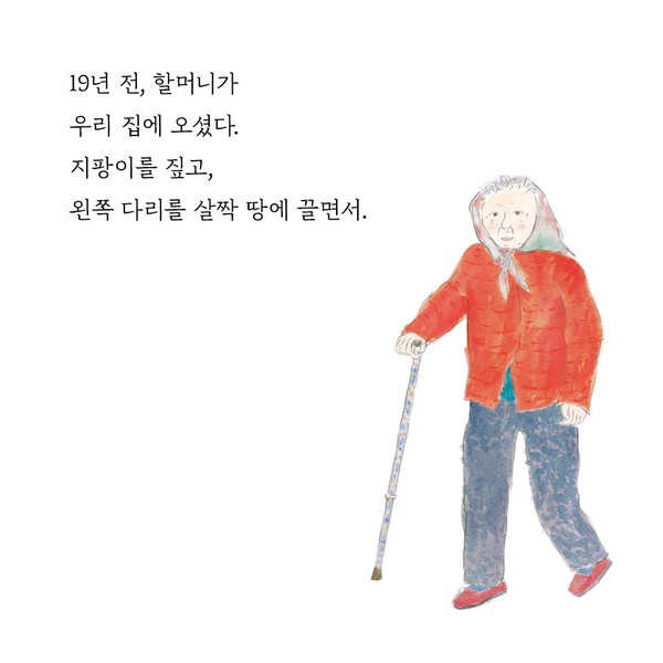 이 그림책은 작가의 실제 이야기라고 합니다. 작가 열 살 무렵 할머니가 집에 오시고 어느새 19년이 지났다고 해요. ‘다리를 절며 지팡이를 짚고’ 오셨다고 씌여 있는 걸로 봐서는 갑작스런 병환으로 거동이 불편해 진 바람에 딸의 집에 의탁하게 되셨구나 짐작하게 됩니다.