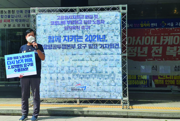 휴직 및 휴업수당과 관련된 법은 평균임금의 70%를 지원금으로 지급하라고 명시하고 있습니다. 그런데 코로나 이전에 받아왔던 초과근무수당과 비행 수당 등이 빠지면서, 소득이 100만 원에서 150만 원 이상 줄어든 분들도 계십니다. 한편, 일자리를 잃은 분들이 1만 5000명 정도 됩니다. 이분들은 무급휴직을 강요당한 경우가 많아요. 초기에는 무급휴직 상태로 버티다가 상황이 길어지다 보니 실업급여라도 받기 위해 떠난 분들이 많습니다. 올해는 9300명 정도가 무급휴직상태로 남아있고, 고용유지지원금을 받으며 유급 휴직하거나 순환 근무를 하는 노동자가 1만 명 정도 있는 것으로 확인됩니다.