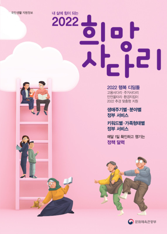 최근 정부는 모든 국민이 생활 필수 지원정보를 쉽게 찾을 수 있도록 ‘내 삶에 힘이 되는 희망사다리 2022’를 발간했다. 일상생활에 꼭 필요한 정책 200여 개를 생애주기별, 분야별로 수록하였으니 적극 활용하기 바란다.