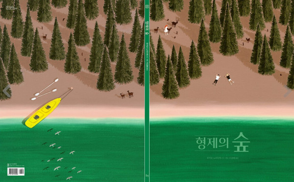 <형제의 숲>에는 그닥 많은 활자가 있지 않다. 점점 변해가는 숲과 사람들을 크게 보여주고 한두마디를 덧붙이는 식이다. 그래서 작가는 어떤 머리색을 가진 형제가 더 ‘올바른 선택’을 한 것인지 확정하지 않는다. ‘결과에 감탄하기’와 ‘결과를 자랑하기’ 사이에 옳고 그름을 가릴 수 있는가. ‘거둬들이기’와 ‘불러 모으기’ 사이에는? ‘먹고살기’와 ‘부자 되기’는 또 어떤가? 하지만 커다란 종이 위에 선명한 색감으로 그려지는 그림들을 함께 보자면 말하고자 하는 것은 분명해진다.