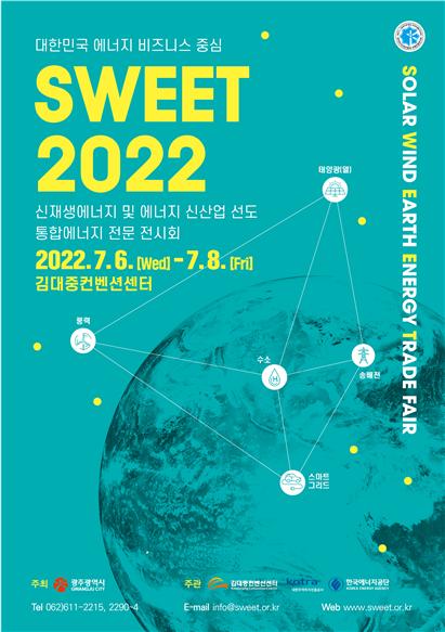 신재생에너지인 풍력, 태양광, 수소 연료, 에너지 저장장치(ESS), 스마트그리드 등 핵심기술과 제품을 한자리에서 만날 수 있는‘SWEET(Solar, Wind & Earth Energy Trade Fair) 2022’가 6일부터 8일까지 김대중컨벤션센터에서 개최된다.