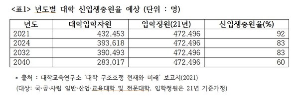 <표 1>에서 보여주는 대학 입학 자원의 감소뿐만 아니라 대학을 진학해야 하는 이유도 점점 사라지고 있는 것이다. ‘교육통계연보’에 따르면 한국의 대학 진학율은 2008년을 전후로 역대 최고치인 80%까지 근접하다가, 2020년 72.5%정도로 과잉진학율을 보이고 있어 이 또한 향후 감소할 전망이다.