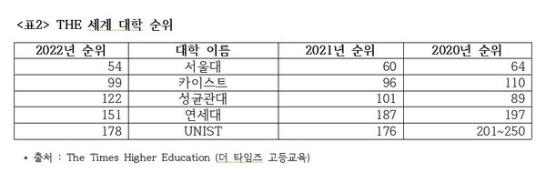 (전문가 의견 2) THE 세계대학순위(영국 대학평가기관인 타임즈고등교육 발표 순위)는 교육여건 30%, 연구실적 30%, 논문 피인용도 30%, 국제화 7.5%, 산학 협력 2.5% 등 주요 5개 지표(총 13개 지표)를 활용하여 순위를 매긴다. <표 2>를 살펴보면 국내대학은 세계 50위권에 들어가는 대학이 하나도 없다. 100위권 안에 들어가는 대학도 서울대, 카이스트 등 2개 대학뿐이다. 그것은 대학 경쟁력이 세계대학과 비교할 때 상당한 격차가 존재한다는 것을 의미한다.
