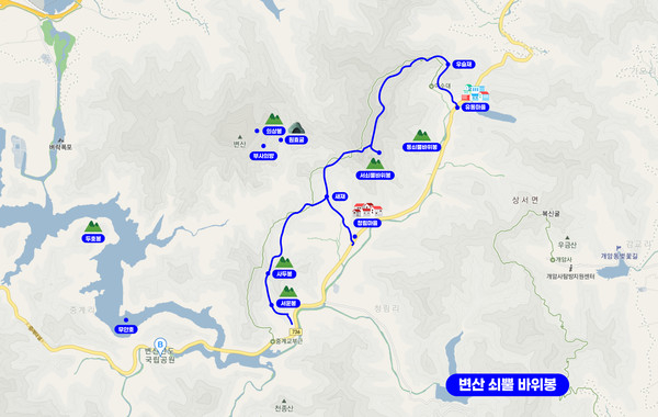 청림마을로 하산하는 갈림길 새재삼거리에 이르러 사두봉 방향으로 진행한다. 새재삼거리에서 중계교 부근까지는 3.0km 가량 오르내리기를 반복하다가 사두봉 암릉지대에 올라서면 첩첩산중에 나타난 부안호의 절경에 감탄사가 터진다.