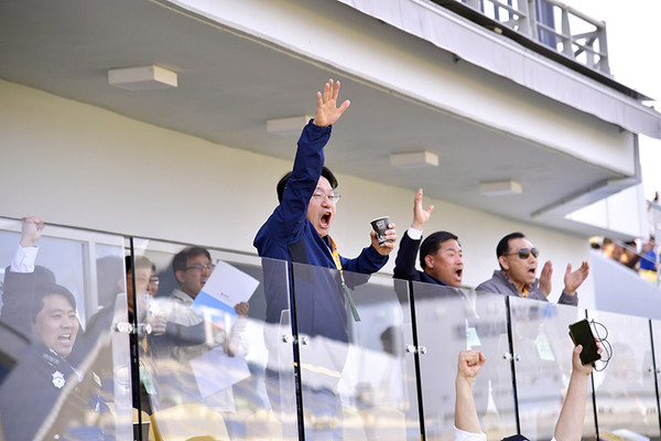 강기정 광주광역시장이 1일 오후 광주축구전용구장에서 열린 K리그1 광주FC와 수원FC의 홈경기를 관전하며 전반 광주FC의 선제골이 터지자 환호하고 있다.