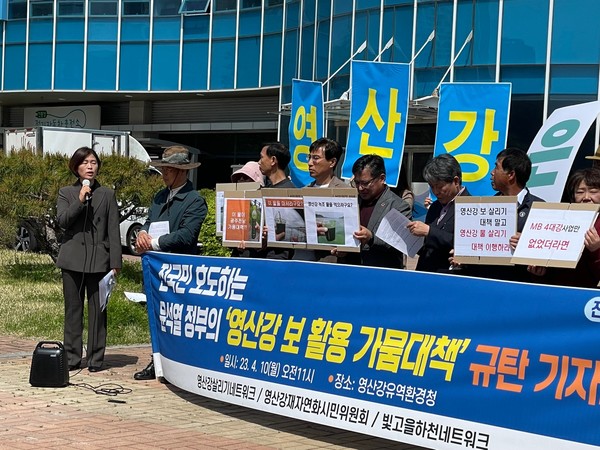‘윤석열 대통령 4대강 보 활용 가뭄대책 규탄 4대강 유역 동시 기자회견’이 영산강유역환경청 앞을 비롯해 서울 광화문광장, 환경부 앞, 낙동강 유역 앞에서 동시에 열렸다.