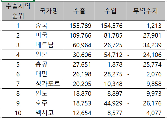 아래 <표 1>에서 보듯이 인도는 한국의 8위 수출국이지만, 한국은 인도와의 교역에서 많은 흑자를 보고 있다. 2022년 기준 인도는 한국 무역 흑자 교역국 4위를 기록하고 있는데, 이는 2021년 5위에서 2022년 4위로 한 계단 올라선 것으로 한국은 인도와의 무역에서 대략 100억 달러 규모의 흑자를 보고 있다.