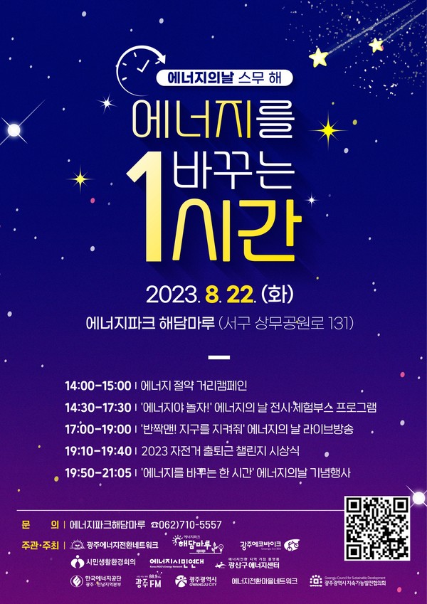 오후 7시 50분부터 진행되는 ‘에너지를 바꾸는 한 시간’ 행사는 에너지의 날을 주제로 한 공연과 토크콘서트를 진행하고 에너지시민연대 주관, ‘불을 끄고 별을 켜다’라는 표어로 해담마루를 비롯한 전국 17개 시도에서 동시 개최한다. 당일 행사는 네트워크 유튜브에서 온라인으로 생중계할 예정이다.
