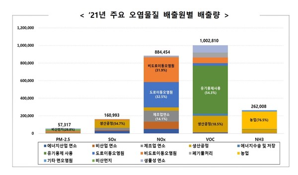 배출량 산정 결과, 2020년 대비 2021년 대기오염물질 증감량은 △초미세먼지(PM-2.5)가 1000톤(2.1%), △황산화물(SOx)이 1만 9000톤(10.6%), △질소산화물(NOx)이 4만 5000톤(4.8%) 감소했으나 △휘발성유기화합물(VOCs)는 1만 2000톤(1.2%), △암모니아(NH3)는 800톤(0.3%)으로 소폭 증가했다.