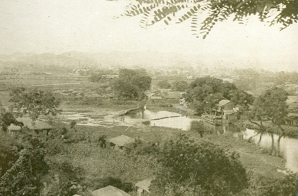 20세기 초엽의 광주천. 앞에 광주천을 가로막은 것이 조탄보이고, 그 뒤편의 거목 왼쪽으로 마을 곁에 보이는 것이 작은 장터다.