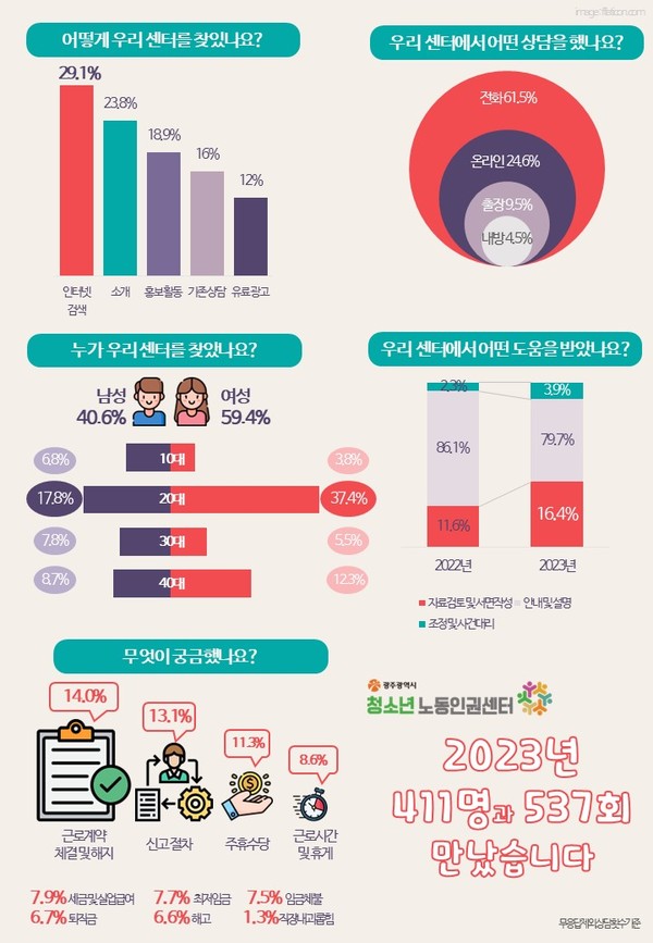 광주광역시청소년노동인권센터 (이하, 센터)는 7일 2023년 동안 접수된 상담 내용을 분석해 발표했다. 통계에 따르면 2023년 센터는 537회 (상담 인원 411명) 상담했다.