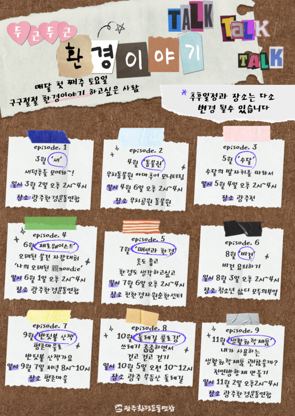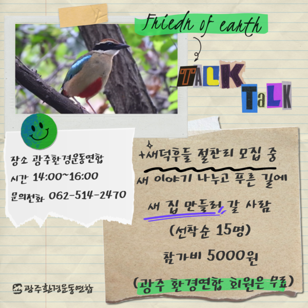 광주환경운동연합은 환경에 관심 있는 시민을 대상으로 환경수다카페 ‘두근두근 환경이야기’ 프로그램 참여자를 모집한다.