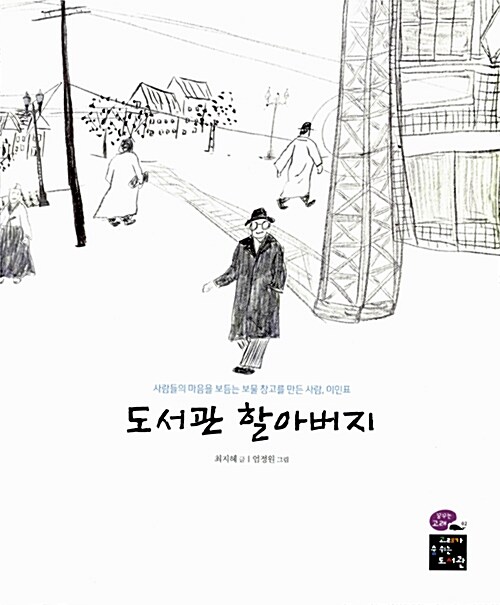 최지혜가 글을 쓰고 엄정원이 그림을 그린 <도서관 할아버지>(2014, 고래가숨쉬는도서관)는 우리나라 최초의 사립 어린이 전용 도서관을 만든 이인표 회장의 이야기를 담고 있다. <도서관 할아버지>는 서사를 따라가는 산문적 특징이 있다거나 미술적 섬세함을 중점에 둔 작품이 아니다. 표지에 부제처럼 적힌 “사람들의 마음을 보듬는 보물 창고를 만든 사람, 이인표”라는 문장에서 알 수 있듯, 그의 일생 자체가 어린이 도서관과 얼마나 긴밀하게 이어져있는지를 증언하는 작품이라고 보는 것이 좋겠다.