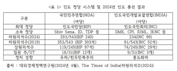 하지만, 인도 총선 결과는 예상과는 약간 다르게 나타났습니다. 현 모디 총리가 속한 인도인민당(BJP)이 주도한 선거연합인 ‘국민민주연합(National Democratic Alliance, NDA)’이 전체 의석 가운데 293석을 획득하여 과반(272석)이상의 의석 확보에 성공했지만, 인도인민당 단독으로 과반수 의석을 차지하는데 실패하였습니다. 하여 국민민주연합에 속한 다른 정당들과 연정이 불가피해진 것입니다. 네루 초대 총리의 증손자인 라훌 간디 전 인도국민회의(INC) 총재가 주도한 야당 선거연합인 ‘인도국민개발포괄연합(Indian National Developmental Inclusive Alliance, INDIA)’은 이번에도 다수당이 되지 못하여 총리 배출에 실패하였습니다.