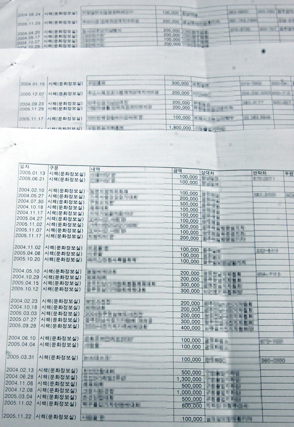 해당 구청장 업무추진비 현금 지출 내역이었다. 2004년부터 2년간의 자료였는데, 의원이 분석해본 결과 매년 900만 원 넘은 돈이 보도 사례금, 행사 격려금 등의 명목으로 지출된 것으로 기록돼 있었다.