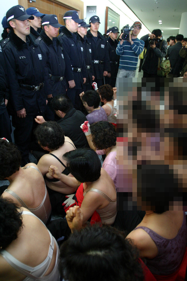 2007년 3월 7일 오후 2시, 상무지구 광주시청사 시장실 앞. 상무지구 광주시청사를 청소하는 50·60대 노동자들이 “일하고 싶다”를 외치며 박광태 광주시장실에서 농성에 들어갔다. 청소 위탁업체 변경으로 고용 승계가 불투명해지자, 사실상 사용주인 광주시가 고용을 보장해달라고 호소하는 집회였다. 하지만 광주시는 “자신들의 소관이 아니다”는 입장이 확고했고, 농성도 강제 해산시킬 것이라는 입장이었다. 이 같은 분위기 때문에 여성 청소 노동자들은 속옷 바람으로 시청을 지키고 있었다. 손대지 말라는 절박함의 표현이었다.