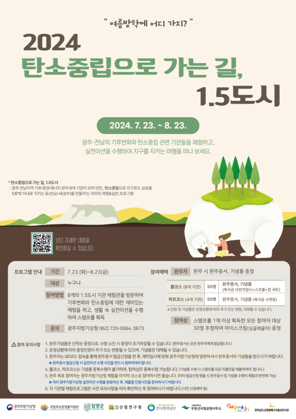 광주에너지파크해담마루(센터장 김광훈)는 오는 8월 23일까지 기후변화와 탄소중립에 대한 이해와 확산을 위한 체험·실천 프로그램인 '2024년 탄소중립으로 가는 길, 1.5도 시'*를 진행한다.