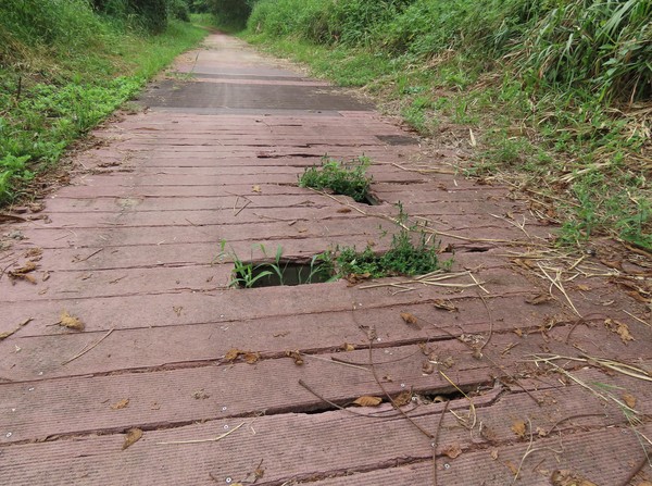 임곡교를 지나 용진교를 향해 걷다보니 여기저기 부서진 데크길이 위험하게 방치돼 있다. 안내판을 보니 광주시가 황룡강 생태하천 조성공사를 하면서 설치한 탐방 데크가 관리가 되지 않아 위험하게 방치된 것이었다. 낡아서 난간이 부서지고 발 아래로 구멍이 크게 나 있어서 자칫하면 안전사고로 이어질 수 있겠다. 사람의 출입을 막는 안내조차 없다. 철거나 보수 등 적절한 조치가 시급해 보인다.
