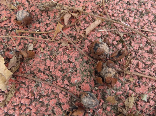 징검다리를 건너 강가를 따라 걸어가니 가래나무 열매가 발에 치인다. 광주천에도 황룡강에도 가래나무가 많은데, 물가에서 많이 볼 수 있는 나무중의 하나이다. 가래나무는 한반도와 만주를 중심으로 서식하는 토착식물인데, 중국에서 호두나무가 도입되면서 예전만큼 흔히 보이지는 않는다고 한다. 한자어로 가래나무 추(楸)자를 써서 추자라고도 하는데, 어렸을 때 마을 어르신들이 ‘추자’라고 불러 나도 한동안 추자로 알고 있던 가래나무이다. 내가 살던 마을에서도 가래나무는 계곡 물길 옆에 있었는데, 여름철 물놀이를 하다가 나무에서 떨어진 열매를 바위에 열심히 문질러 깨 먹었었는데, 초록색 껍질이 다 닿아 없어지도록 문지르다 보면 내 손이며, 옷이 온통 초록색으로 물들어 며칠이고 까만 손으로 지냈던 기억이 난다. 단단한 껍질 속에 감춰진 고소한 열매를 꺼내 먹었던 추억이 고스란히 생각난다.