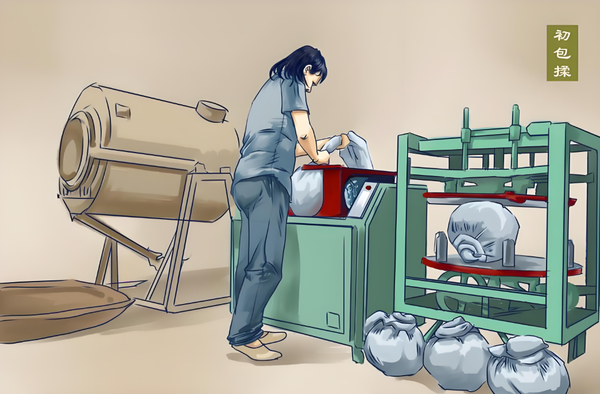 그림에서 보이는 기계식 포유는 좌측의 초청기(炒靑機)에서 살청을 마치고 나온 찻잎을 면포로 싸매주고, 우측의 포유기(包揉)에서 다시 유념을 진행해 준다. 포유기의 상면과 하면 및 측면은 서로 압력에 눌림을 받게 되어있고, 이러한 과정에서 보자기 속의 찻잎은 갈 곳이 없어 서로 부딪치며 둥글게 말려간다. 포유는 두 번에 걸쳐 진행되는 데 초벌 포유를 마친 찻잎은 다시 불을 대어 약간의 건조를 진행시킨 부홍(復烘)을 거쳐, 재벌 포유를 진행한다. 물론 지금도 일부 지역에서는 포유를 수공으로 진행하기도 한다.