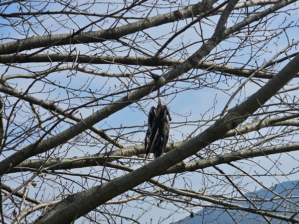 아! 이번에는 나뭇가지에 걸린 새다. 누구인지, 왜 이런 모습으로 남겨져 있는지 궁금하다. 때까치의 경우 사냥을 하면 먹이를 저장하기 위해 나뭇가지나 날카로운 가시 등에 먹이를 꽂아두기도 한다는데 때까치가 범인일까? 찍은 사진을 조류 박사님께 보내고 물어보니, 사진만 봐서는 어떤 새인지 알 수 없고, 참새보다 조금 더 큰 때까치가 사냥하기에는 나뭇가지에 있는 새는 크다고 하셔서 용의자에서 때까치를 제외시키게 되었다. 아쉽지만 아직은 풀지 못한 미제사건으로 남겨야겠다.