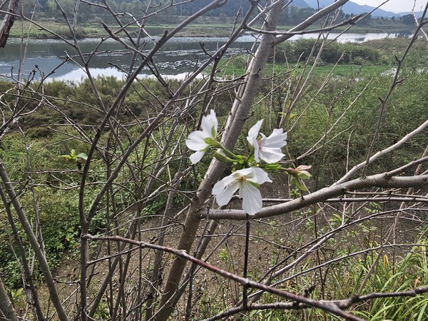 강둑을 따라 늘어선 벚나무. 아! 벚꽃이 피었다. 한 그루에서만 핀 것이 아니라 여기저기에서 작은 꽃송이들이 활짝 피어있다. 잎은 다 떨어졌는데, 앙상한 가지에 철을 모르고 피어난 꽃송이들. 가을에도 꽃이 피는 춘추벚꽃일 가능성도 있겠지만 나무마다 한 송이 정도씩 드문드문 핀 걸 보면 철을 모르고 따뜻한 기온 탓에 피어난 것 같다.