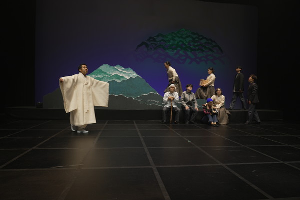 마당극 형식이라지만 무대에 올리다보니 빨치산 아버지가 활동했던 지리산을 형상화한 배경이 뒤쪽 무대에 고정적으로 세워져 있다. 소설에서는 주로 화자의 회상신에서 아버지가 나온다. 문자언어로 돼 있는 소설에서는 아무런 무리가 없는 일이다. 하지만 배우가 연기해야 하는 연극에서는 이미 죽은 아버지를 어떻게 처리할지가 문제였을 텐데, 신명은 처음부터 아버지를 무대에 세운다. 그러니까 아버지의 유령 되겠다.