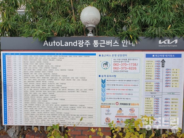 기아 오토랜드 광주(기아차 광주공장)에 접해있는 무진대로에 통근버스들이 줄지어 주정차해 퇴근 시간대 교통 혼잡으로 불편하다는 시민이 본보에 제보했다. 기아차 광주공장 직원들의 출퇴근용 전세버스 50여대가 매일 특정시간(오후 3시 30분 전후)대 몰리면서 벌어지고 있는 교통 혼잡을 지적한 것. 본보 취재 결과 매일 기아차 2000여 명의 노동자들이 전세버스로 출퇴근 중이며, 공장 일대 혼잡은 이들을 내려주고 태우는 과정에서 벌어지고 있는 것으로 확인됐다.