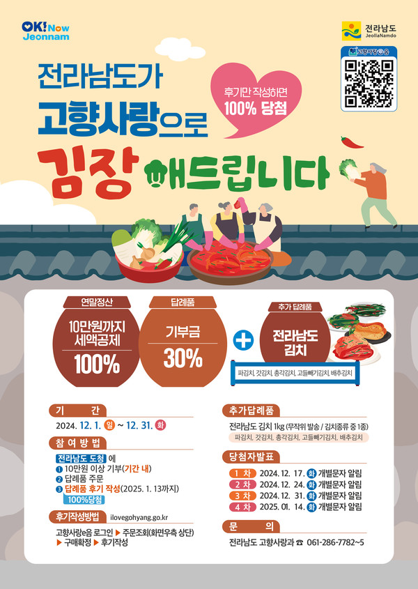 3일 도에 따르면 ‘고향사랑e음’이나 전국 농협은행을 통해 전남도청에 10만 원 이상 기부하고 답례품을 주문·수령한 뒤, 후기를 작성하면 김장 김치가 자동 신청된다.