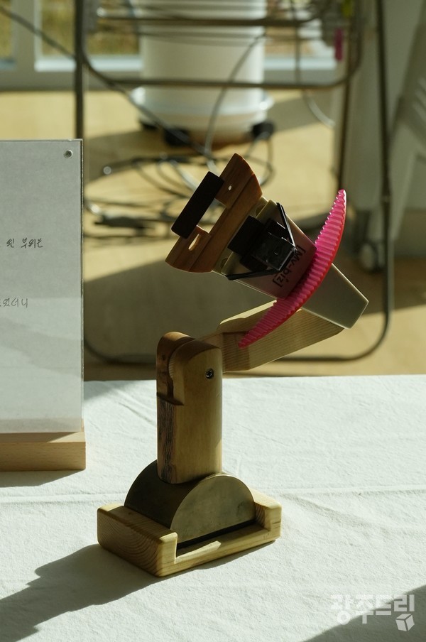 A4용지 보면대와 자투리 나무, 촛대를 조합해 스마트폰 거치대는 그의 창의력이 돋보이는 작품이다. 그는 “이제 눈과 척추가 편해졌다”며 만족감을 드러냈다.