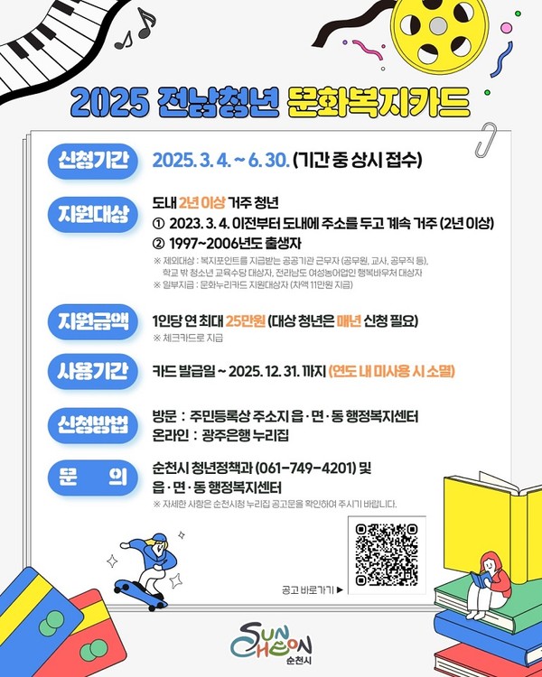 순천시는 청년들의 문화생활 향유 및 자기계발 활동을 지원하기 위해 2025년 전남청년 문화복지카드 지원사업 대상자를 6월 30일까지 모집한다고 밝혔다.