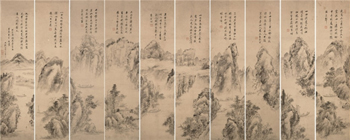 10폭의 화면은 대체로 상단과 하단으로 구성되어 있지만, 구분되지 않고 하나의 덩어리로 구성된 공간을 보여주기도 한다. 조심스러운 선묘로 경물의 윤곽을 그리고 옅은 먹으로 바위의 결과 나뭇잎을 묘사하였으며 청색과 황색 등으로 부분 채색을 하였다.