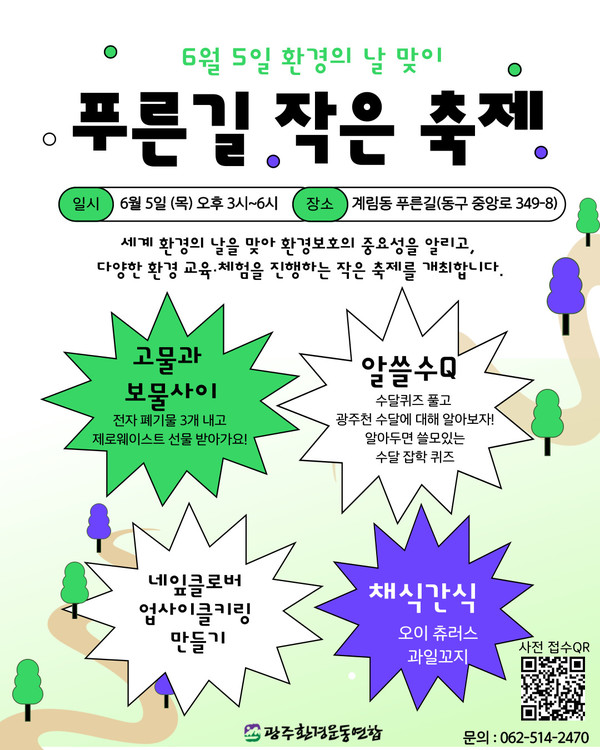광주환경운동연합(공동의장 최홍엽, 박미경, 이철갑, 조진상)은 세계 환경의 날을 맞이해 5일 오후 3시부터 6시, 동구 계림동 푸른길 공원 일대에서 다양한 환경 교육·체험 프로그램을 통해 환경 보호의 중요성을 알리는 ‘푸른길 작은 축제’를 개최한다.