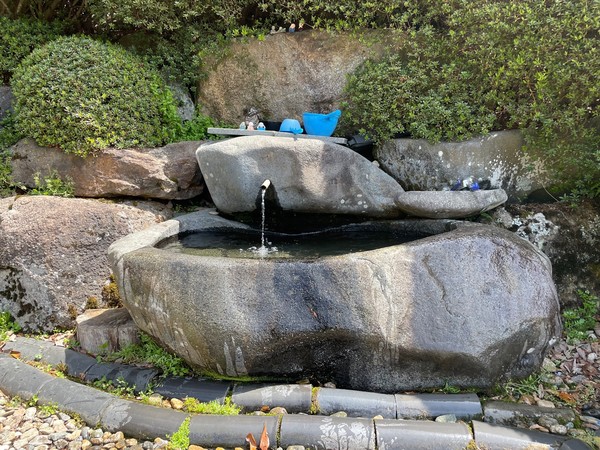 ▲칠불사 유천수: 대웅전 우측 연못 앞에 있다. 스님의 말씀에 의하면, 새벽 예불을 드리기 위해 다기에 물을 뜨러 오면 그 물에서 우윳빛이 난다고 해서 “유천(乳泉)”이라는 이름을 가지게 되었다고 한다. 대웅전으로 올라가는 석축의 돌들이 붉게 변한 것으로 보아, 이곳 바위에는 철(Fe) 성분이 많음을 알 수 있다. 쓴맛에 더해 떫음이 길게 나온다.