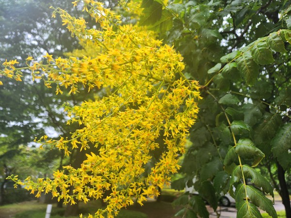 푸른 바다가 보이는 완도 갈문리와 대문리 해안숲에서는 황금꽃 핀 모감주나무군락이 눈길을 끈다. 올여름도 열돔현상으로 도심지역은 평균 36-37도를 기록하고 밀집지역은 37도를 초과하고 있다. 숨이 턱턱 막히는 무더위 속에서도 그 나무 아래에 들어서면 공기가 한결 상쾌해진다. 가지마다 달린 황금빛 꽃송이들은 마치 작은 비단 등불을 수없이 매달아 놓은 듯 화사하고, 그 아래 드리운 그늘은 아담한 황금 우산처럼 포근한 쉼터가 되어 준다. 은은한 향기가 열대야와 폭염을 뚫고 바닷바람으로 번져 나와 달아오른 몸과 마음을 감싼다. 쏟아지는 뙤약볕 아래에서도 모감주나무 그늘에 잠시 몸을 숨기면, 자연이 건네는 작은 위로가 온몸에 스며드는 듯하다.