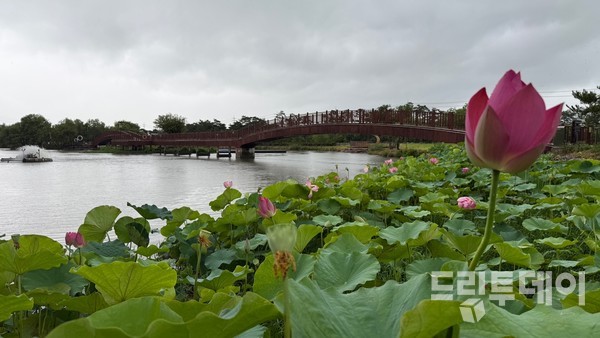 그런데 목요일 오늘 나에게 연꽃의 사진을 보내주신 선생님과 또 조감저수지를 찾았다. 모질게 비가 내리고, 바람이라기 보다는 강풍이라 해야할 거센 바람속에서 풀잎처럼 하늘 거리는 연꽃을 다시 만났다. 스스로를 유지하는 방법을 아는 연방죽에서 나는 잠시 숙연함을 느꼈다. 그리고 기왕 영암의 연꽃을 공개했으니 고대의 해상항로였던 상대포 호수 공원의 연꽃도 카메라에 담아 공개한다. 연꽃 같은 향기를 품고 있는 영암에서 자연과 인간의 화해를 도모해 보시면 좋겠다.