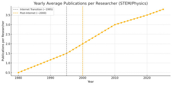 연구 활동 자체가 기술의 도움으로 용이해지자, 양적인 산출물도 급격이 많아졌다. 물리학 분야 기준, 1990년대 까지는 연구 활동과 출판 프로세스가 모두 느렸기에, 대부분의 연구자가 평균 1년에 0.5~1.5편의 논문을 출판하고 공동 저자 수도 적었다. 인터넷이 발달하면서 2000년대 이후에는 1인당 논문 출판이 2~4편까지 늘었다. 공동 연구자도 늘고 1년에 논문을 3~4편 발표하는 연구자도 있다. 인터넷 시대 이전의 과학은 좀 더 느린 걸음을 걷고 있었을지 모르겠다. 그치만, 그 발걸음 사이는 사색과 토론으로 채워졌을 것이다. 그것이 물리학의 비약적인 발전을 이끌었다.