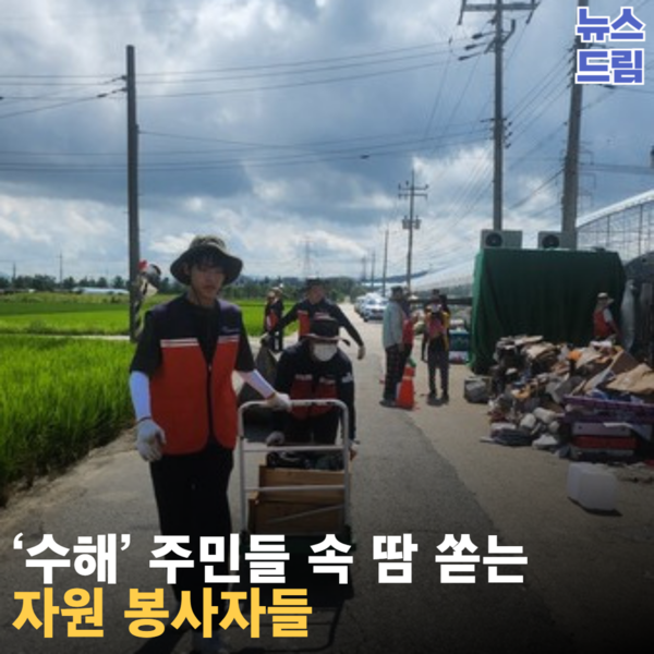 '수해' 주민들 속 땀 쏟는 자원 봉사자들