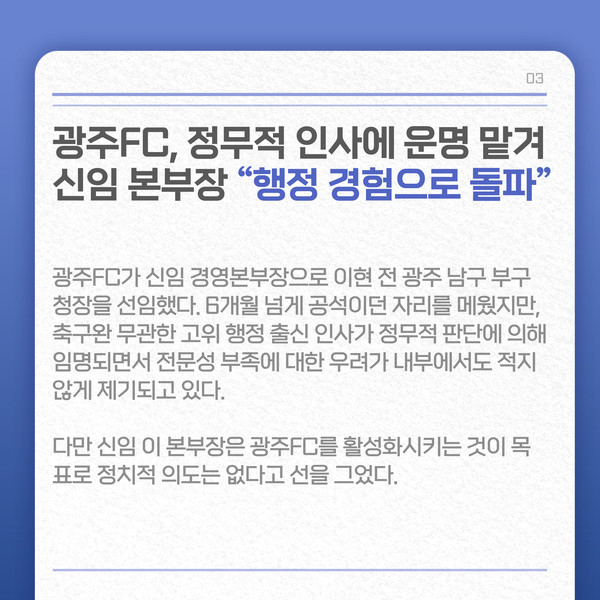 광주FC, 정무적 인사에 운명 맡겨…신임 본부장 “행정 경험으로 돌파”