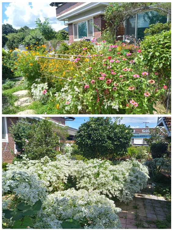 곰돌곰순이네 마당에는 노랑 코스모스(‘황화국’이라고도 하는)와 백일홍, 설악초가 한창입니다. 돌아서면 기억이 잘 나지 않는 곰돌곰순은, 꽃들을 보면서, 그렇구나, 우리가 노랑 코스모스, 백일홍 씨를 여기에 뿌렸구나, 합니다. 하지만 산책하다 보면, 우리가 여기에도 뿌렸다고? 할 때면, 아무래도 작년에 씨가 바람을 타고 날아왔나 보다, 하게 됩니다.